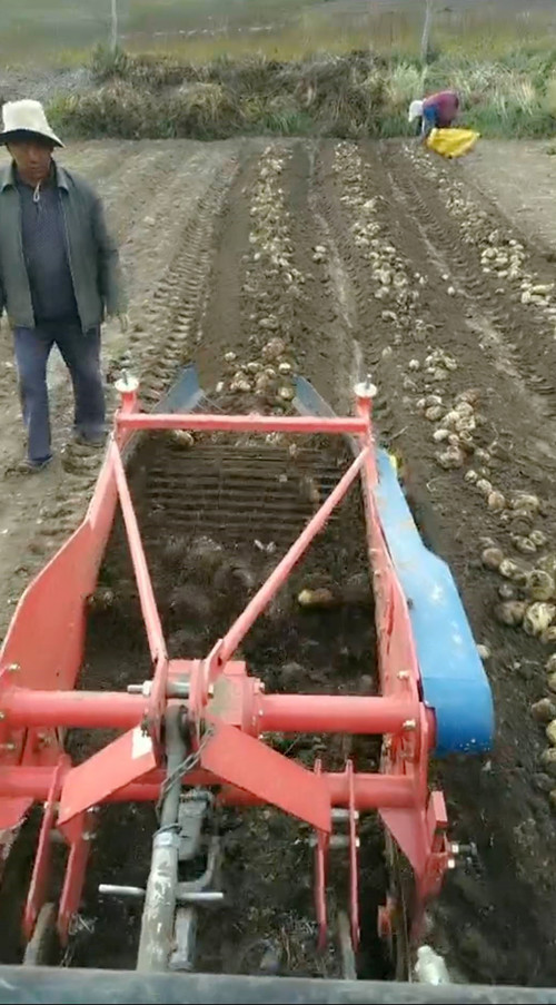 山東菏澤魯富機械紅薯收獲機,大型收獲機廠家直銷,一次可收獲雙行,大型收獲機作業時,收獲機在拖拉機的驅(拖)動下,紅薯秧與土一起被挖掘鏟鏟起;隨著機具前行,鏟起的紅薯秧薯和土被推送到輸送分離裝置上,輸送分離裝置在運行中,因不斷轉動和有序抖動,輸送分離裝置上的馬鈴薯秧薯隨著防堵塞裝置旋轉到輸送鏈向上爬行的同時,其上的土壤由于輸送鏈的抖動而被不斷的清除;秧果上升至輸送鏈高端后經左右兩側的集薯裝置被成條的鋪放在已收區地面上,以便晾曬與撿拾。