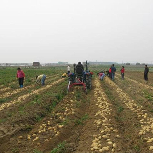 山東曹縣魯富機械公司馬鈴薯收獲機通過懸掛裝置懸掛在農用拖拉機后方.并由拖拉機提供動力,收獲之前需要用殺秧機將馬鈴薯薯秧切碎.收獲機在拖拉機的牽引下向前行進時,馬鈴薯、薯秧與泥土一起被挖掘鏟鏟起。隨著機具向前運行,鏟起的馬鈴薯、薯秧和泥土被輸送到輸送分離裝置上方.分離裝置由于抖動裝置的不斷轉動而產生有序的抖動.且分離裝置上方的馬鈴薯薯秧隨著防纏繞裝置的旋轉運動到輸送鏈上.經兩級分離后.馬鈴薯表面黏著的泥土由于輸送鏈的抖動而逐漸被清除,收獲的馬鈴薯運動到輸送鏈尾端后經過尾篩平鋪到地面上,以方便晾曬與拾撿。